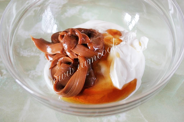 Для крема соедините сметану, вареную сгущенку и мёд.