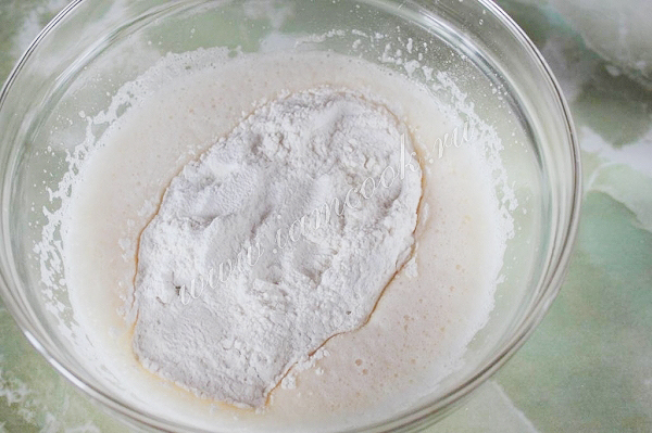 Добавьте муку с разрыхлителем и щепоткой соли и перемешайте.