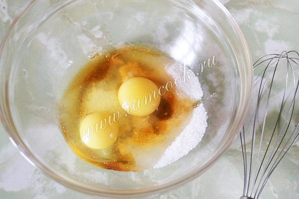 Для теста хорошо взбейте яйца, сахар и мёд.