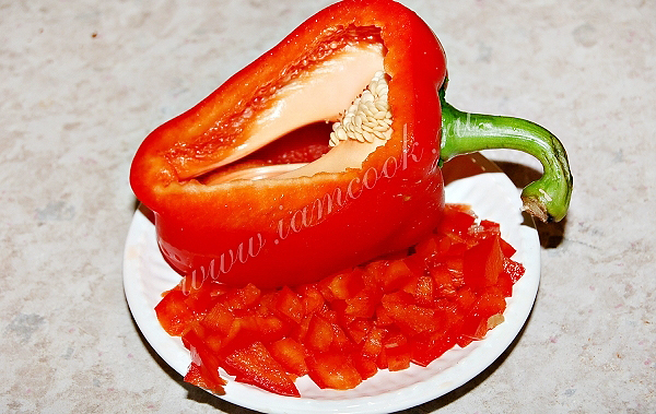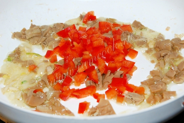 Нарезанные кубики перца добавить в сковородку и обжаривать вместе с другими овощами 7 минут.
