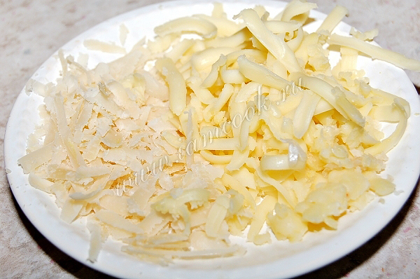 Натереть на крупной терке сыр пармезан и второй вид сыра (например, Гауда, Эдам, Чеддер и т.п.).