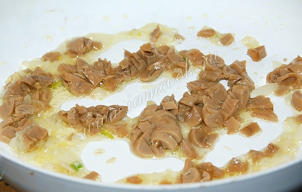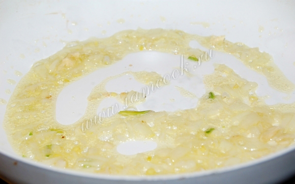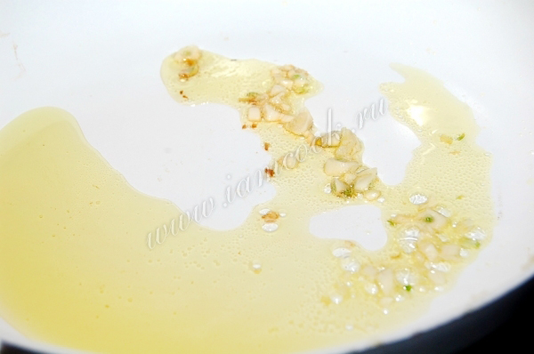 На сковороду налить оливковое масло, выложить в нее мелко нарезанный чеснок и обжаривать его до легкого чесночного запаха.