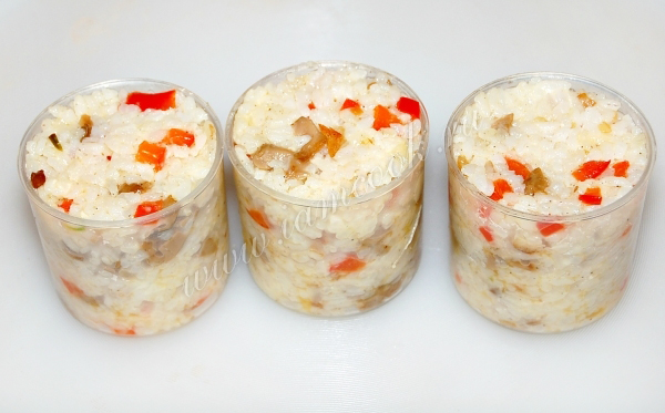 Рис с грибами готов. Выложить горячий рис в стаканчики, плотно утрамбовать.