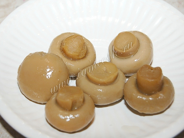 Шампиньоны выложить из банки и дать стечь лишней жидкости.