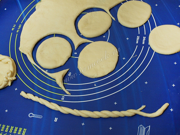 Тесто раскатать в пласт около 0.5 см толщиной,формочкой или стаканом вырезать круги.Из части теста сделать жгутики. Вымерять их по окружности.