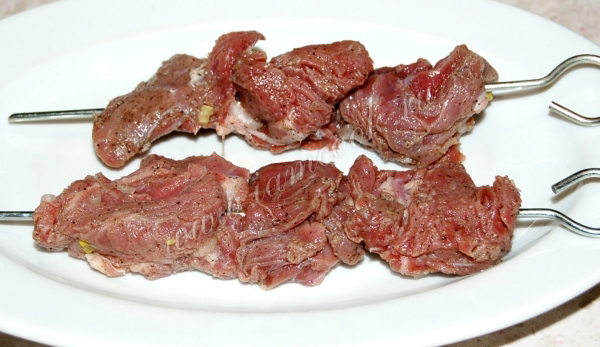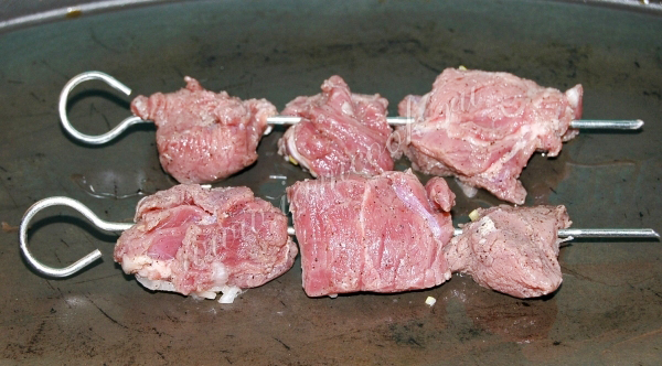 Затем нанизать кусочки маринованного мяса на шампуры. Посолить.