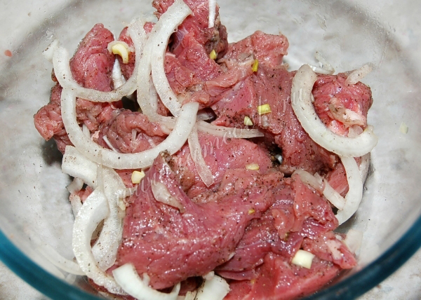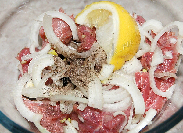 Репчатый лук нарезать кольцами и добавить к мясу. Добавить молотый черный перец. Выдавить лимонный сок.