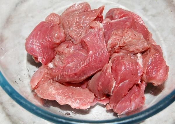 Говяжью вырезку очистить от пленок и нарезать некрупными кусочками.