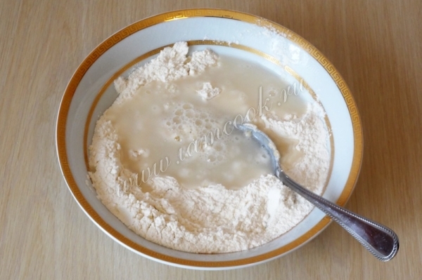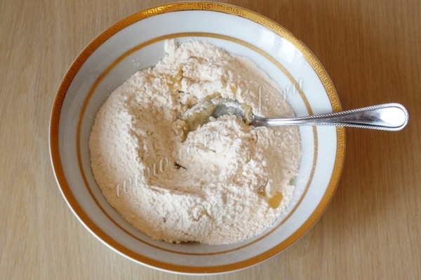2. Муку обязательно просеять, влить масло. Немного вмешать масло в муку.