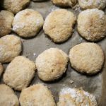 В отдельные тарелки насыпать тростниковый сахар и сахарную пудру. Сформировать небольшие шарики, сначала обвалять в тростниковом сахаре, затем в сахарной пудре. Выложить печенье на противень с пергаментом и выпекать в разогретой до 180 градусов духовке 12 минут.