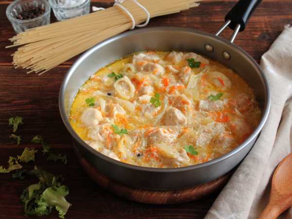 Выложим отварные части курицы и закроем крышку техники, чтобы курица потушилась в соединении ароматов и вкусов. Через 5-7 минут части курицы необходимо перевернуть на другую сторону.