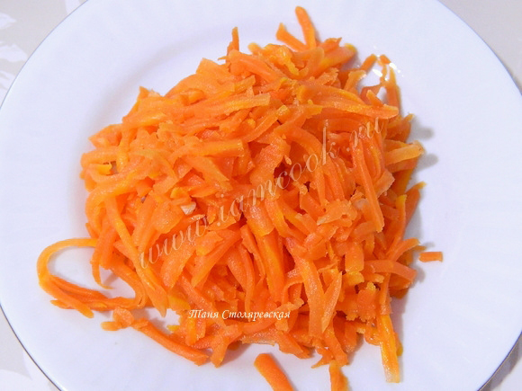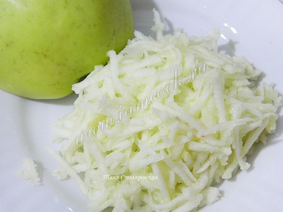 Яблоко очищаем от кожуры, удаляем семечки и так же натираем на крупной терке.