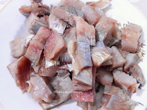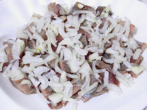 Салат выкладывать слоями сразу в той емкости, в которой будет подаваться на стол. Дно тарелки слегка смазать растительным маслом. Начинаем с самой селедки, засыпаем маринованным луком (перед этим его отжать).