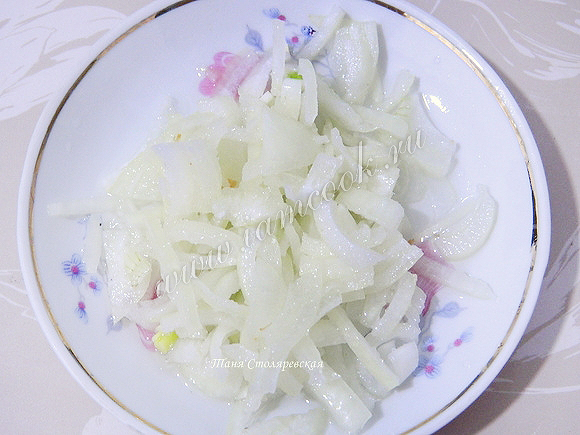 Лук мелко нарезать, добавить уксус и сахар. Оставить мариноваться.