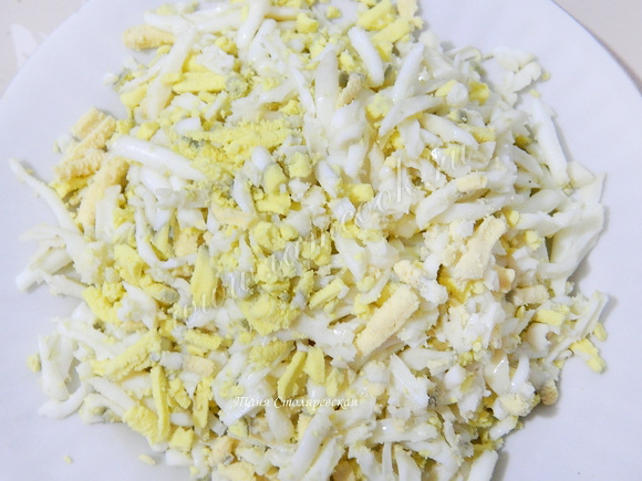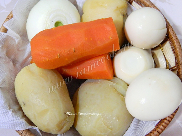 Предварительно отвариваем картофель, морковь, яйца. Очищаем.