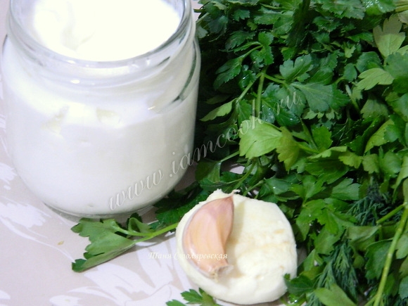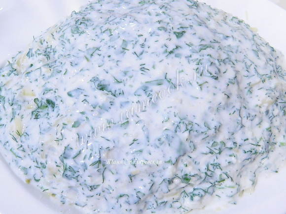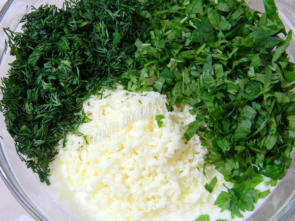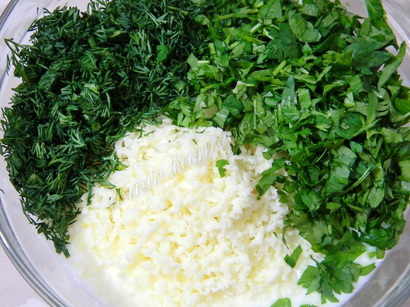 В йогурт измельчаем зелень, выдавливаем чеснок, натираем на самой мелкой терке сыр.