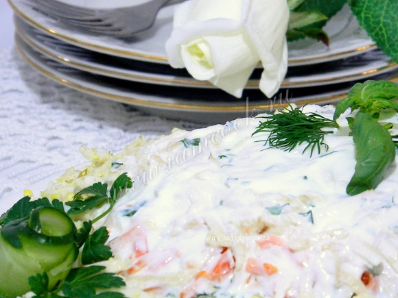 Многим из нас хорошо известен традиционный рецепт приготовления праздничного салата, Селедка под шубой. Но я предлагаю вам попробовать его облегченную версию. Не все могут есть в больших количествах майонез из-за здоровья или кто-то попросту на диете. Свекла и яйца используются здесь только для украшения, но это не принципиально, можете их вовсе исключить. А в общем, салат получается легким и вкусным. Попробуйте обязательно!