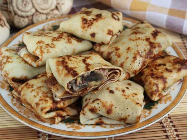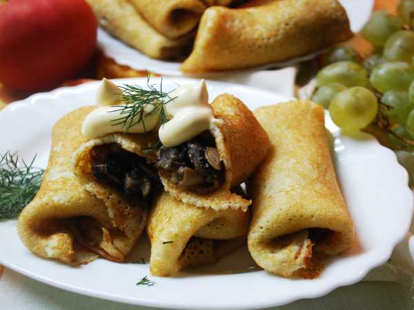 Заверните в каждый блинчик порцию грибной и куриной начинки с салатом или зеленью.