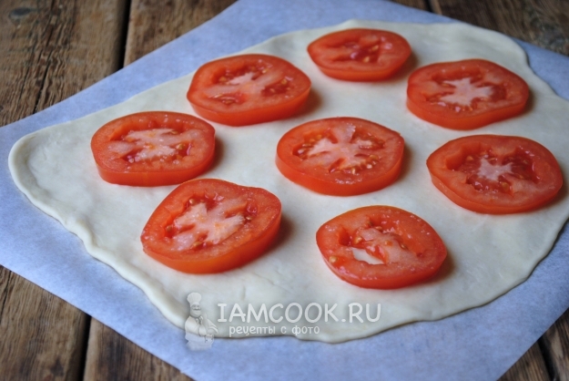 На пласт теста выложить помидорные кружочки, оставляя между ними расстояние.