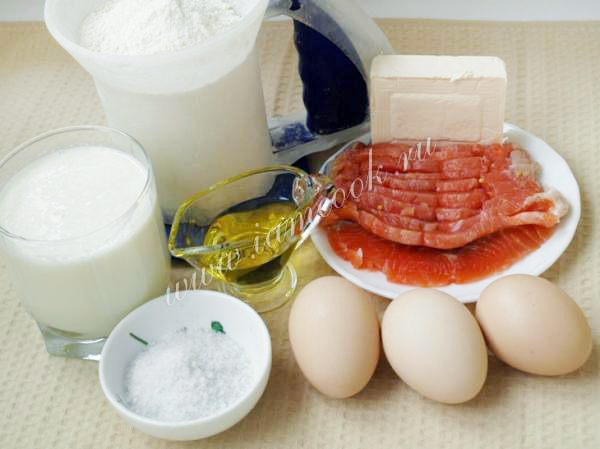 Продукты которые понадобятся нам для приготовления блинов: молоко, мука, сахар, яйца, растительное масло, соль, плавленный сыр и сёмга. Конечно блины можно приготовить и по своему любимому рецепту, мой проверен и тоже очень хорош.