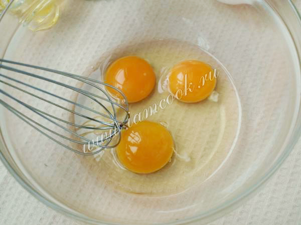 В миску разбить 3 яйца и взбить до устойчивой пены.