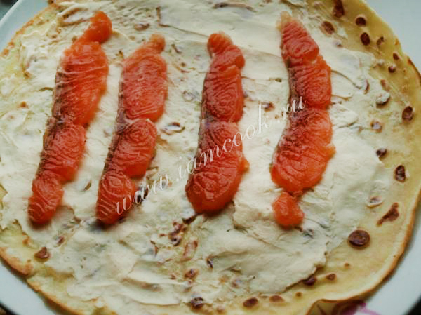Блины смазывать плавленным сыром и выкладывать вдоль кусочки сёмги.