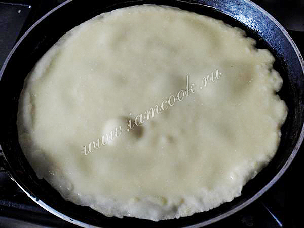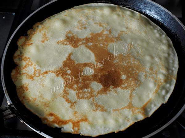 Сковороду смазать растительным маслом, тесто наливать половником и жарить блинчики с одной стороны.