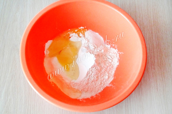 4. Просеять муку. Смешать с оставшейся солью, сахаром. Добавить 1 целое яйцо и 2 желтка. Все хорошо перемешать.