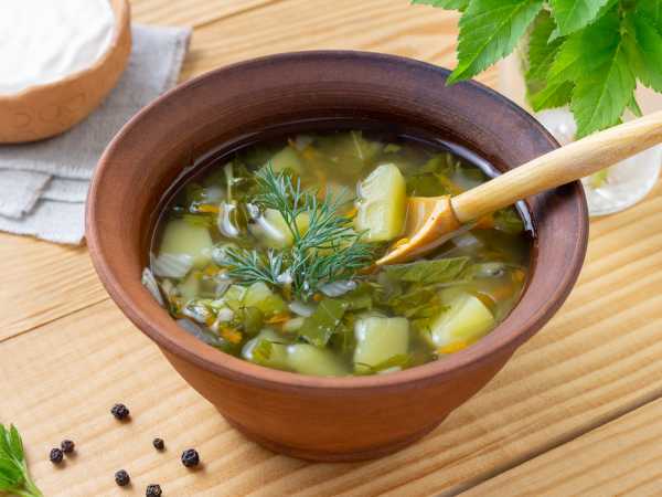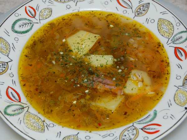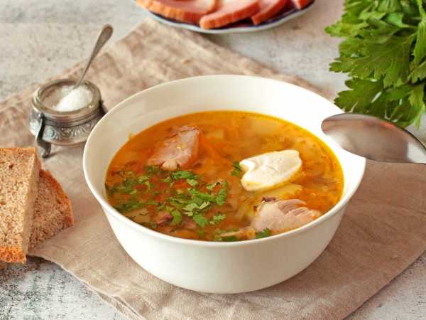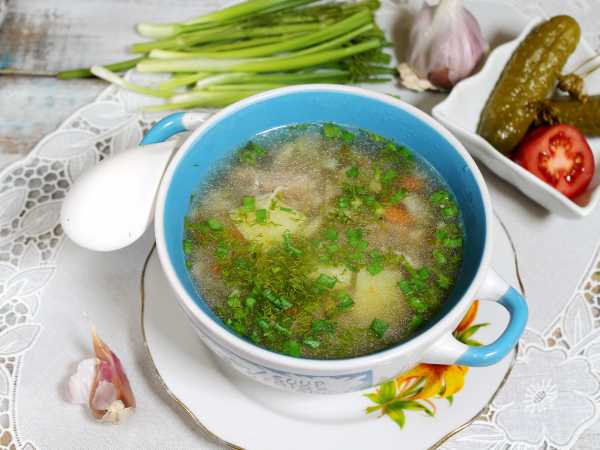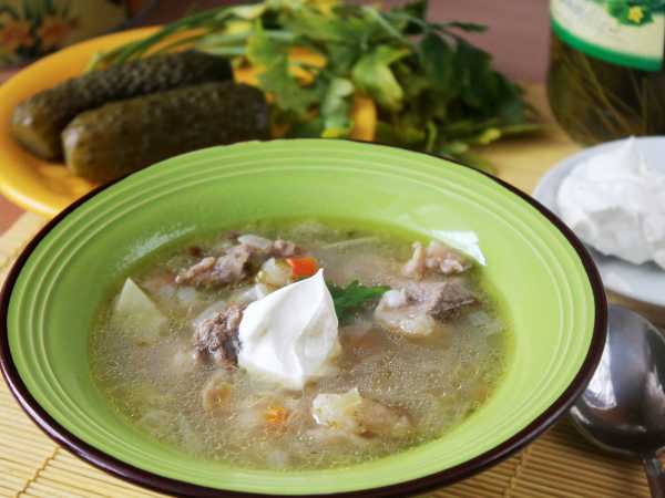 Подать рассольник со сметаной и зеленью.