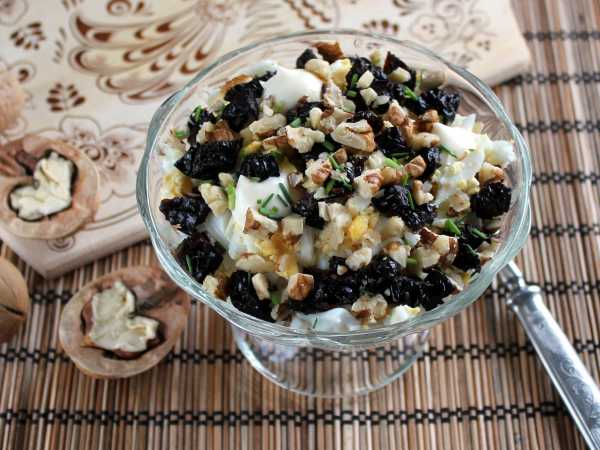 Чернослив промыть, нарезать таким же образом, добавить в салатник. Если сухофрукты суховаты, замочить их перед нарезкой в кипятке на 10 минут.