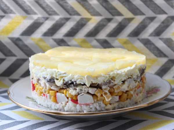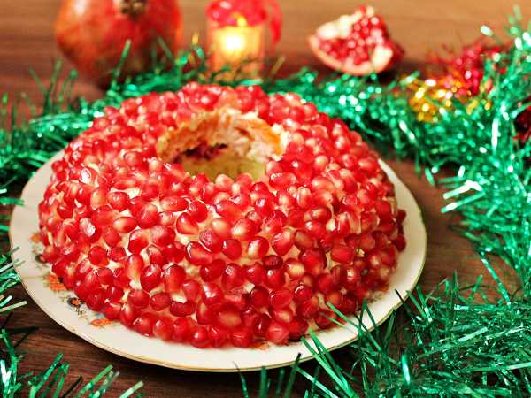 Если заранее оставили 1 отварной желток для оформления блюда, то выложить приготовленный салат в кулинарное кольцо, снять кольцо и присыпать блюдо молотыми грецкими орехами, а затем измельченным куриным желтком.