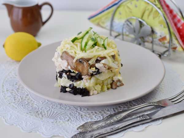 Украсить по своему вкусу и подать к столу. Салат с черносливом, курицей и огурцом готов.