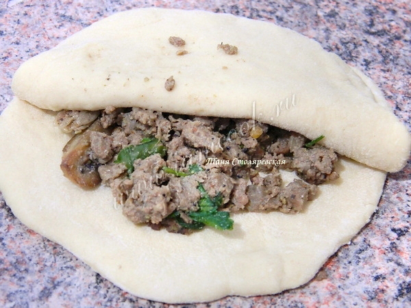 На одну лепешку выкладываем 1-2 столовые ложки фарша, накрываем второй лепешкой и придавливаем края.