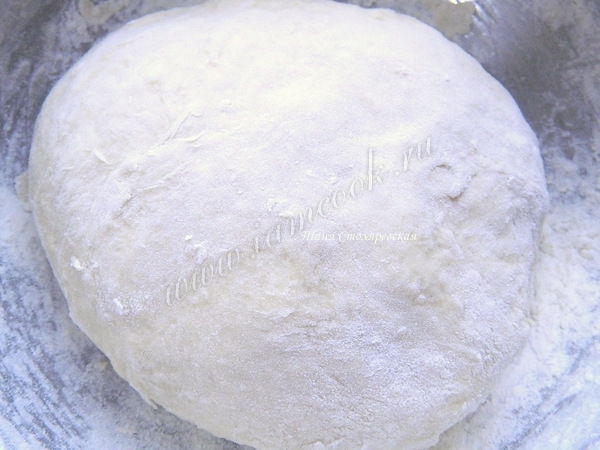 Отдохнувшее тесто выкладываем на посыпанную мукой поверхность и еще пару минут месим.