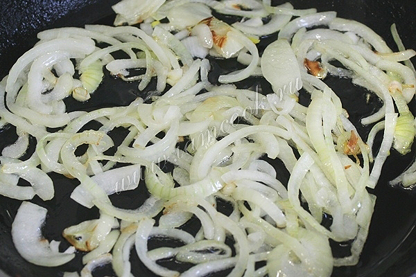 Поставьте сковороду на огонь, налейте немного растительного масла и обжарьте лук до лёгкого золотистого цвета.