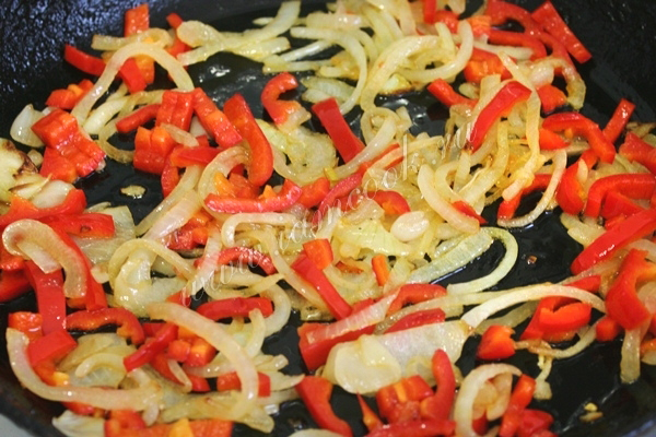 Добавьте перец к луку и жарьте еще примерно 3 минуты.
