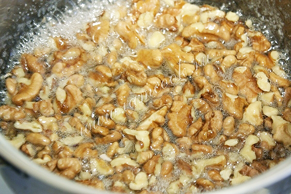 Всыпьте в сироп горячие орехи. Проварите орехи в сиропе 3-4 минуты.