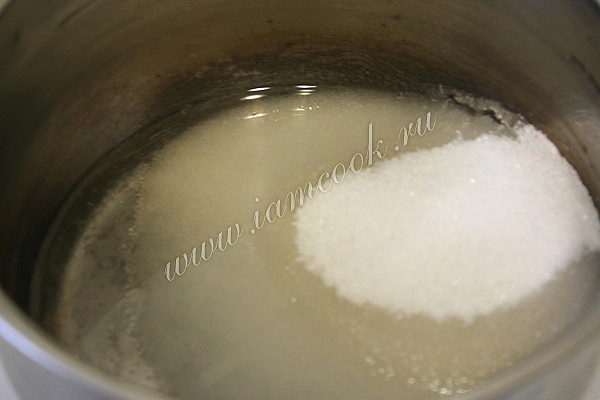 В кастрюльку влейте воду и насыпьте сахар. Поставьте кастрюлю на огонь. Хорошо перемешайте сахар до полного его растворения. После закипания убавьте огонь до минимума и варите сироп примерно 7 минут.