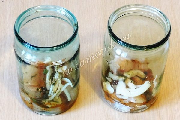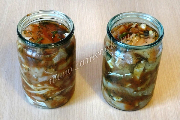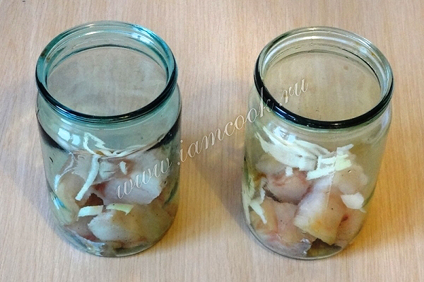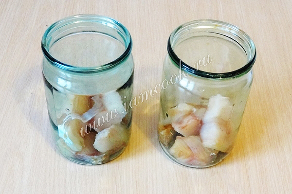 5. В хорошо промытые банки уложить несколько кусочков рыбы. Кстати, о банках и рыбе. Если уверены, что рыба не "залита" водой, то можно укладывать полную банку, так сказать "по плечики". Если же перестраховаться, то лучше уложить на 3/4 банки - иначе будет много сока при тушении, который просто вытечет из банки и придется отмывать духовку. У меня каждый раз по-разному, все зависит от рыбы.