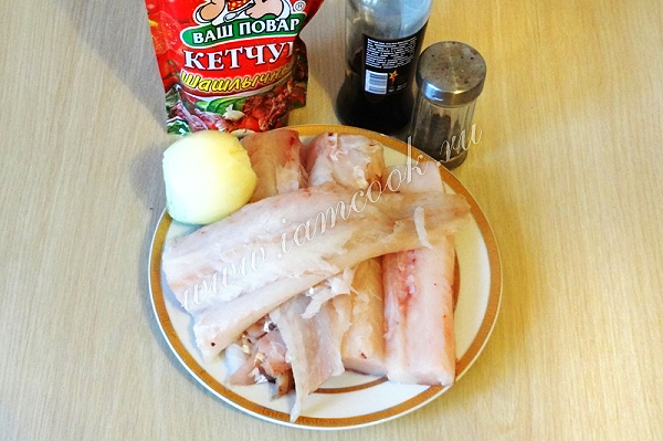 1. Необходимые продукты: филе трески, соевый соус, черный молотый перец, кетчуп, репчатый лук и немного рубленой зелени.