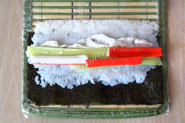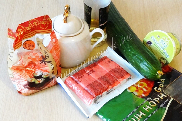 1. Необходимые продукты: рис, нори, крабовые палочки, огурец, сливочный сыр.