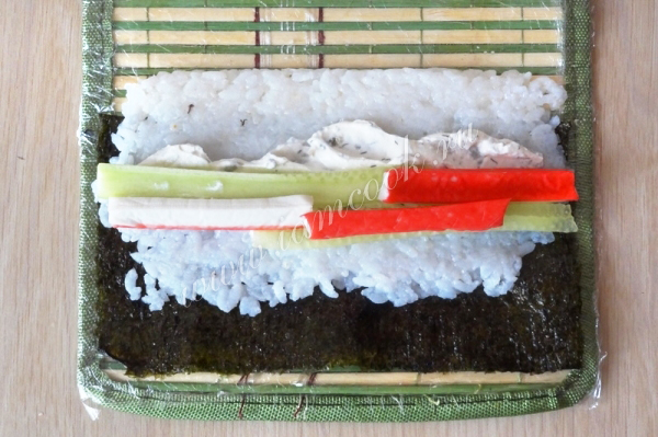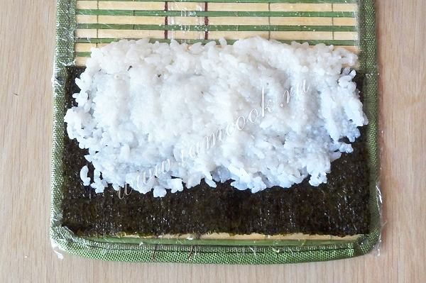 2. Приготовьте рис для суши (например по этому рецепту). Нам понадобиться для одной закрутки 1 горсть готового риса. Положите половину листа нори гладкой стороной вниз на циновку (я циновку оборачиваю пищевой пленкой). Выложите горсть риса. Распределите ее так, чтобы примерно 1 сантиметр нори остался свободным, а рис выступал за нори с другого края на 0,5-1 сантиметра. Прижмите вторым краем циновки для лучшего распределения риса.