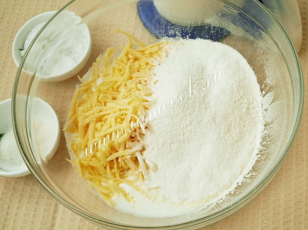 Затем добавить натёртый на тёрке сыр и постепенно всыпать муку.
