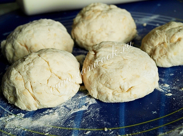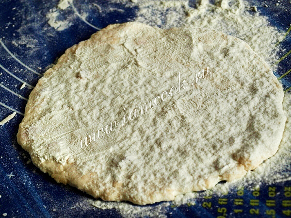 Каждый шарик раскатать скалкой толщиной около 0.7 см. При необходимости присыпать мукой.
