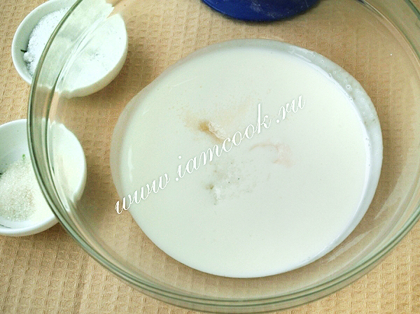 В миску влить кефир, добавить соду, сахар, соль и размешать.