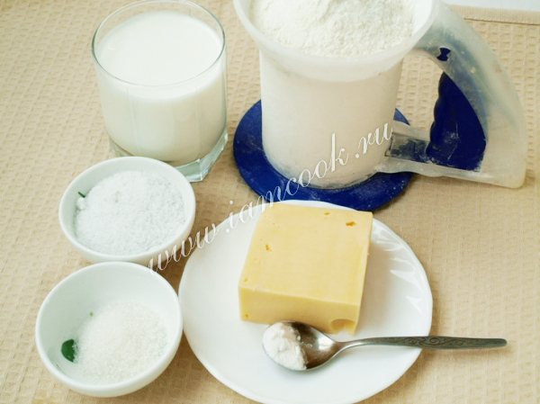 Набор продуктов для приготовления лепёшек очень прост: кефир, мука, твёрдый сыр, сода, сахар и соль.