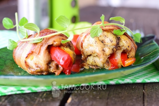 Готовые куриные рулетики в беконе с болгарским перцем и моцареллой подать в качестве горячей закуски или основного блюда.