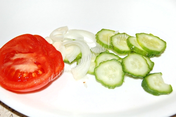 Нарезать тонкими ломтиками помидоры, огурцы и репчатый лук.