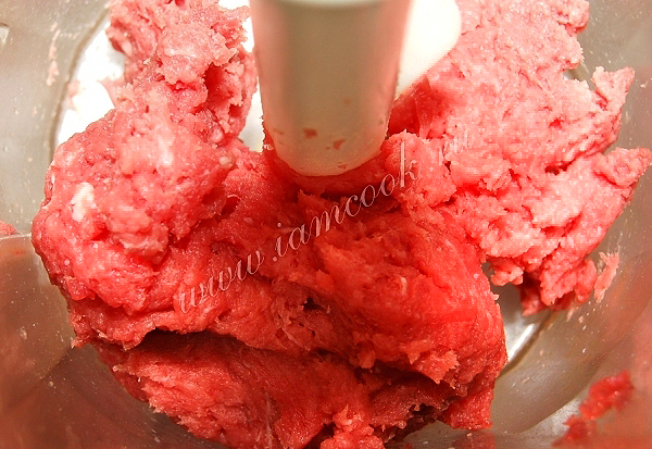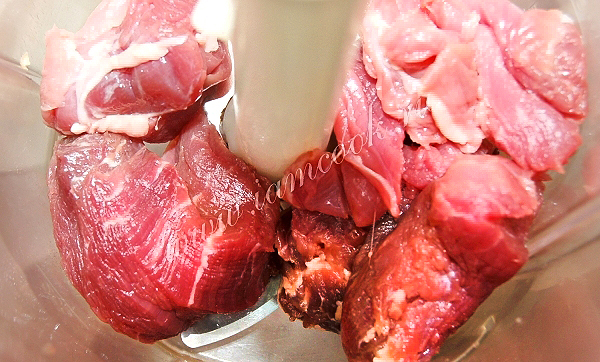 Сначала нужно приготовить котлеты. Для этого мясо нарезать на небольшие кусочки, поместить в блендер.