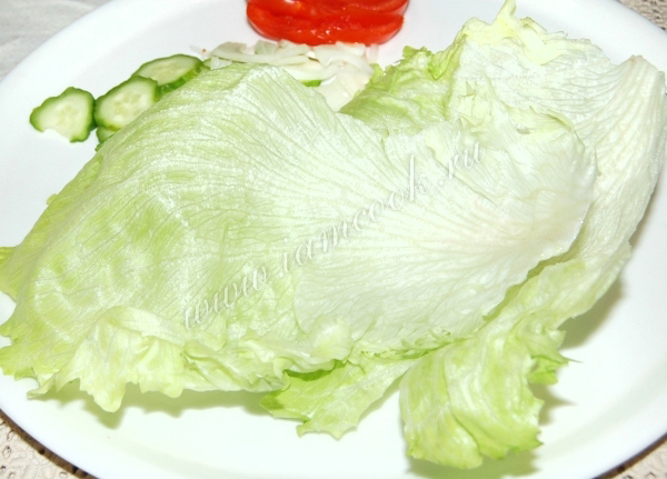 Теперь приступаем к сборке нашей закуски. Расстелить на большой тарелке несколько широких целых листьев салата "Айсберг".